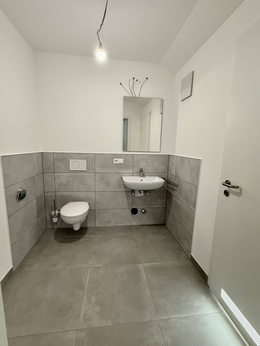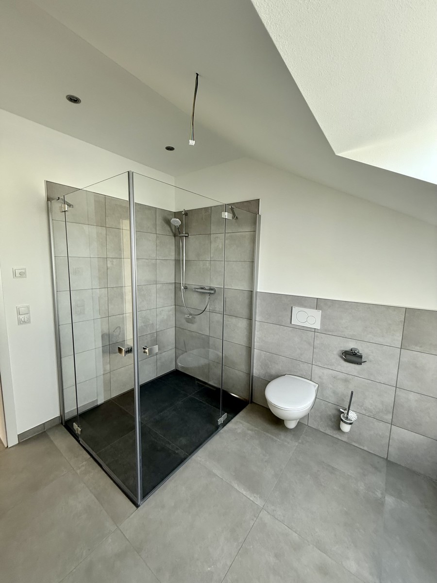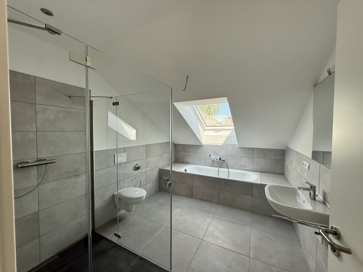 - großes Badezimmer mit barrierefreier Dusche, WC, Waschtisch und Badewanne