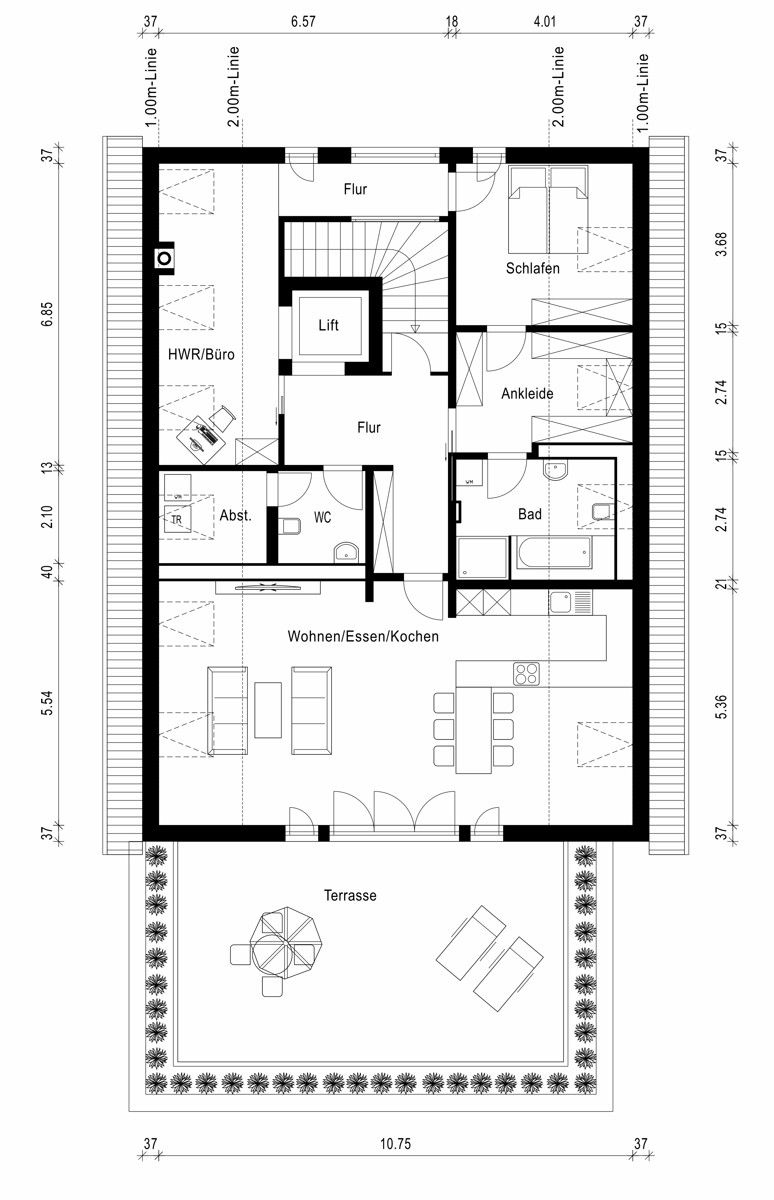 Eine separate Ankleide zum Schlafzimmer bietet ausreichend Platz für Kleiderschränke und Accessoires. Ein praktischer Abstellraum bietet zusätzlichen Stauraum. Der Hauswirtschaftsraum/Büro sorgt für flexible Nutzungen (Arbeitsplatz, Technik, zusätzliche Ablage).